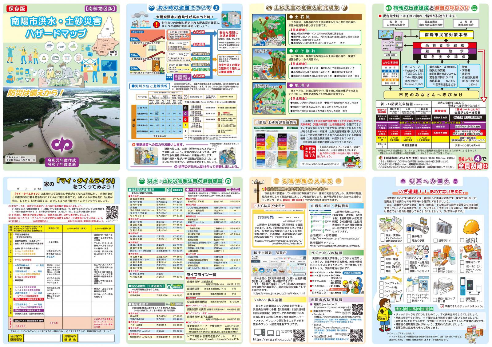 「南陽市洪水・土砂災害ハザードマップ」(南部地区版)(令和7年度更新) 南陽市洪水・土砂災害ハザードマップ(南部地区版) 地図をタップすると拡大して見ることができます。 ※関連ファイルより地図面や記事面をダウンロードすることができますので、ご活用ください。 【地図面】 × (更新日:令和8年3月31日) 【記事面】
