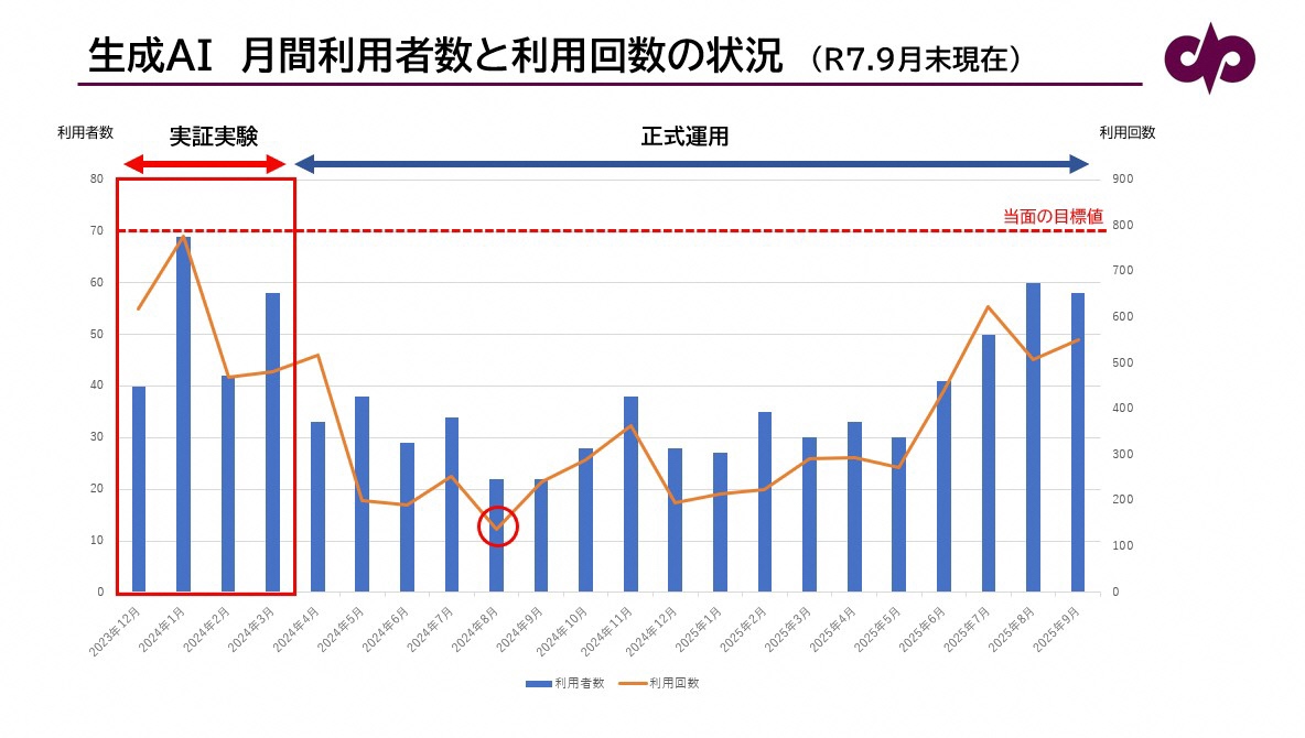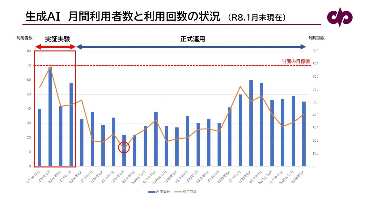 これは、正式運用開始に際し、「日常業務でどのように使えばよいのか」「具体的にどのような業務が効率化できるのか」といった具体的な活用方法が庁内で定まっていないことにより、継続的な利用に至らなかったものと考えられます。2024年8月期が当市において生成AI活用のイノベーションの谷となりました。