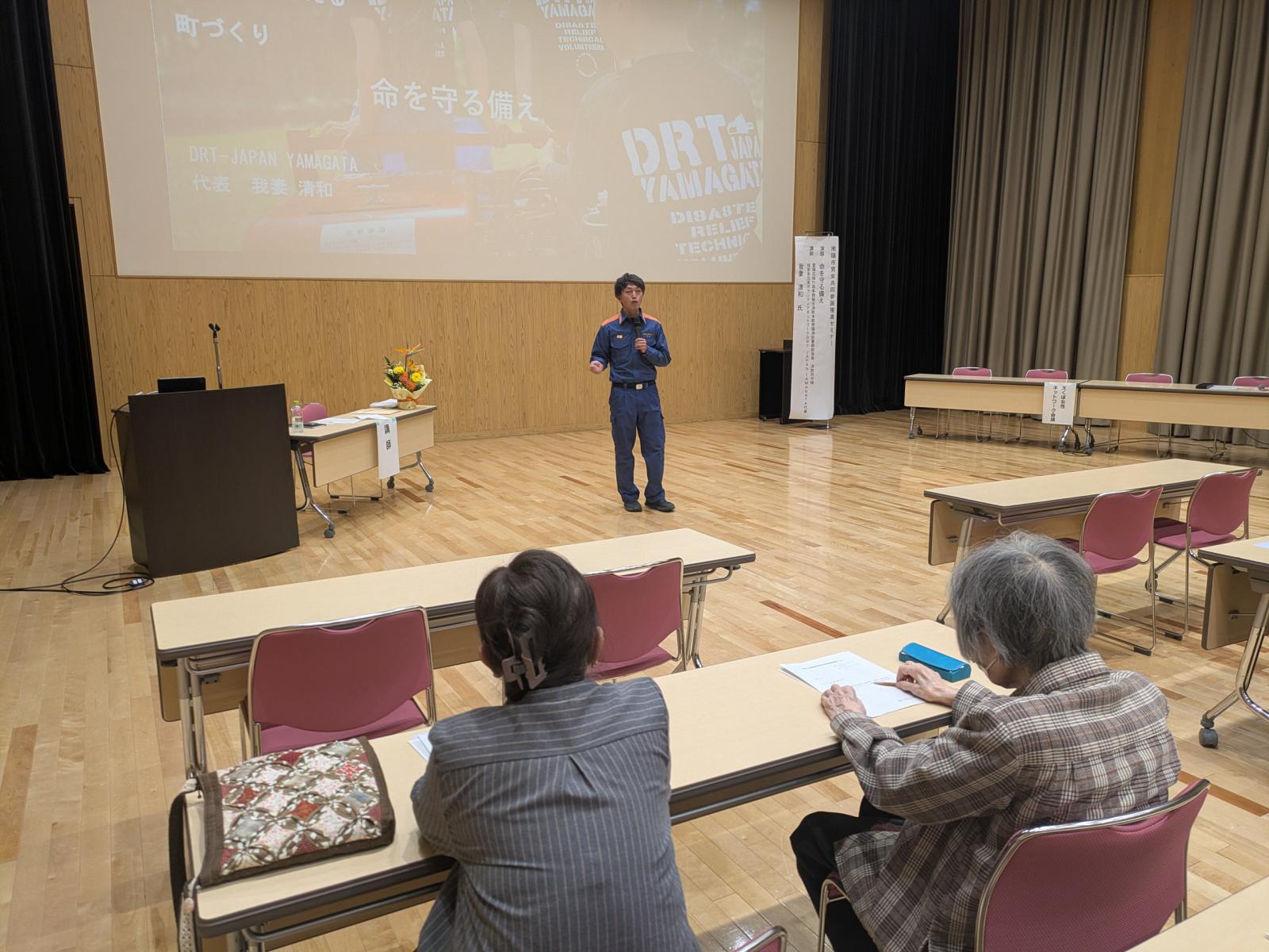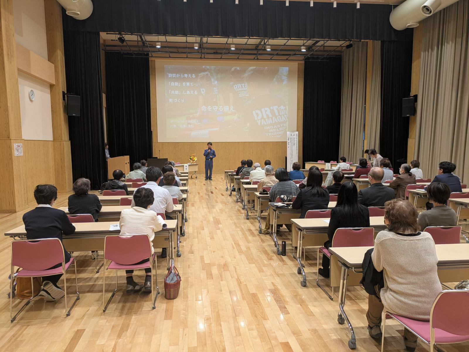板垣致江子会長がセミナー開催の趣旨等を述べた後、講師の置賜広域行政事務組合消防本部南陽消防署救助係長で技術系災害ボランティアネットワークDRT JAPAN YAMAGATA代表の我妻清和様から「命を守る備え」と題して講演をいただきました。