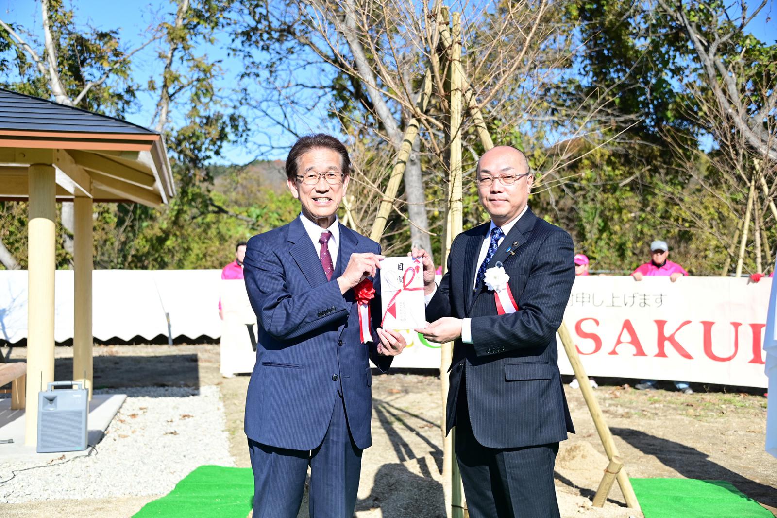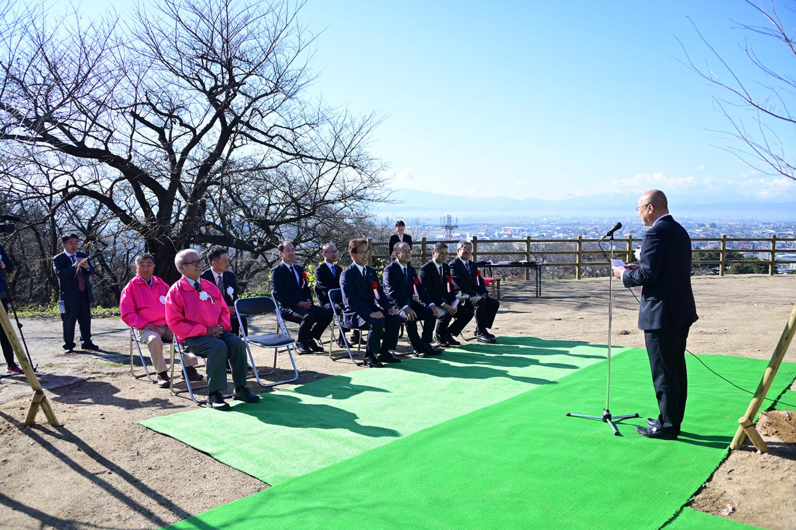 白岩市長からは、「昨年は18本、今年は12本の桜を2年続けてご寄附いただき感謝申し上げます。米沢信用金庫様の桜が烏帽子山の千本桜に加わり、市民のみならず観光客の皆様にも喜んでいただけるものと期待しています。」とお礼の言葉が述べられました。