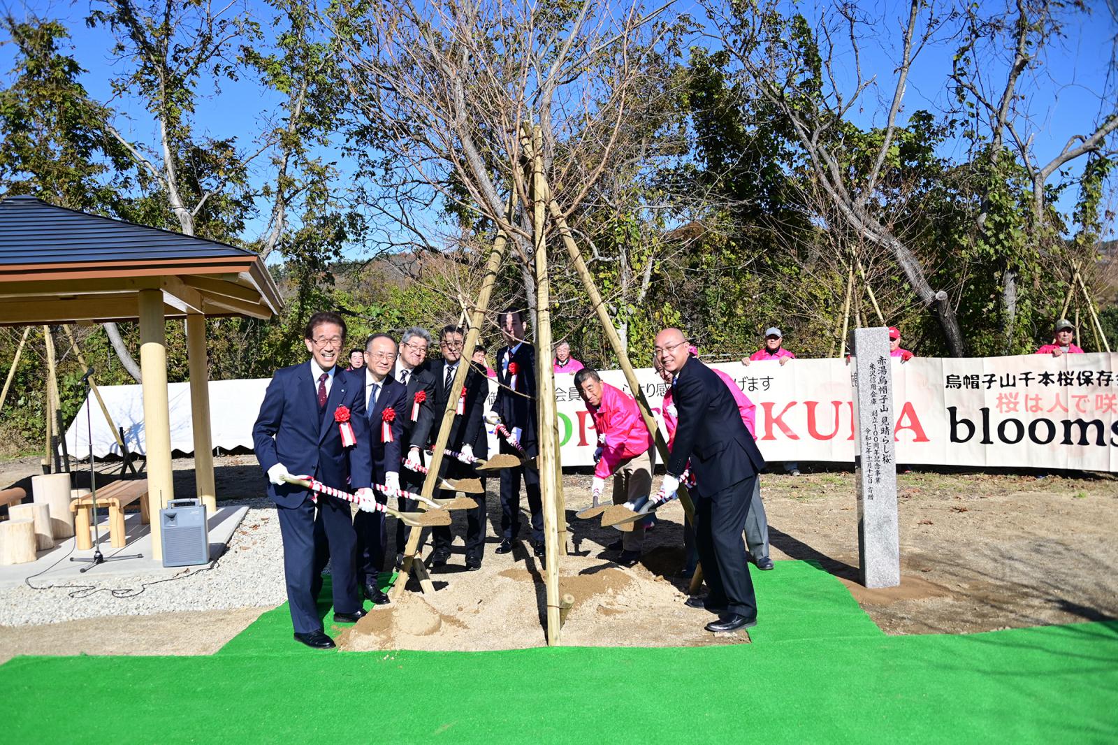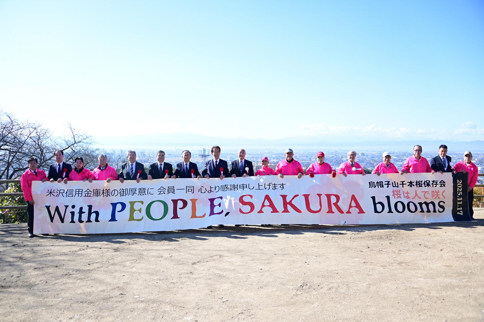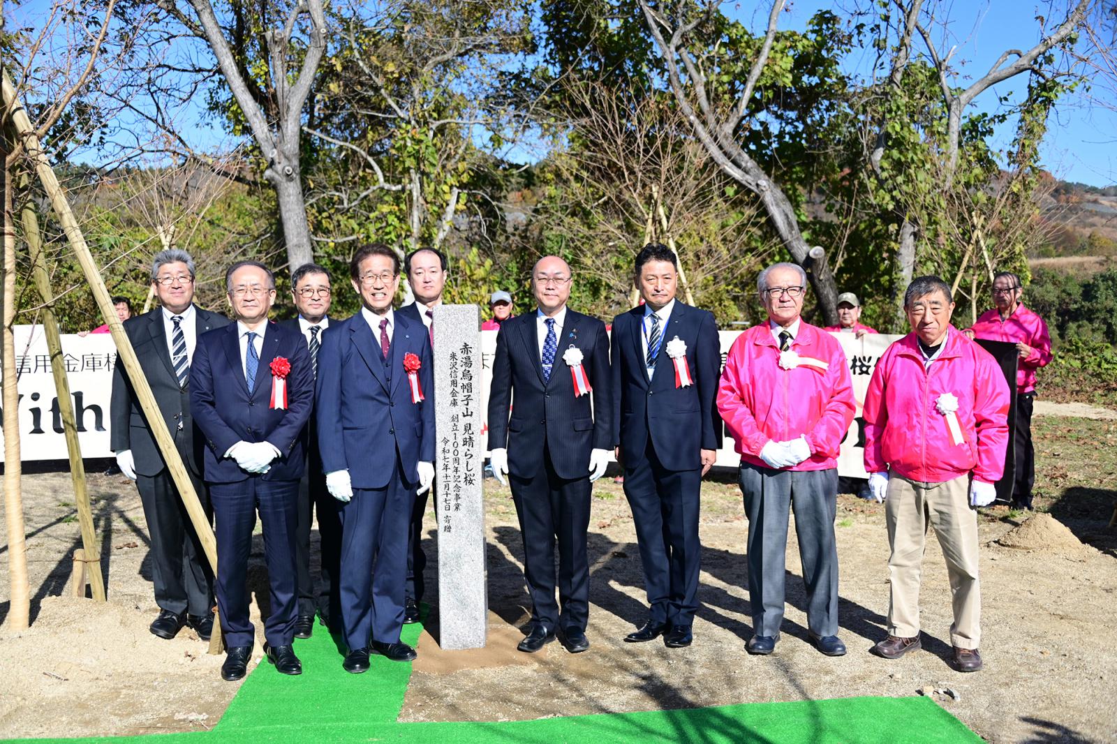 この度、米沢信用金庫様より烏帽子山公園にエドヒガンザクラ12本を含む植栽一式と標柱を寄贈していただき、11月17日(月)現地で桜寄附受納式が行われました。