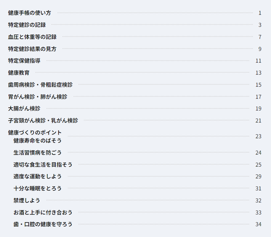 健康手帳とは、特定健康診査・血圧や体重・保健指導等の結果を記録し、ご自身の健康管理に役立てていただくための手帳です。