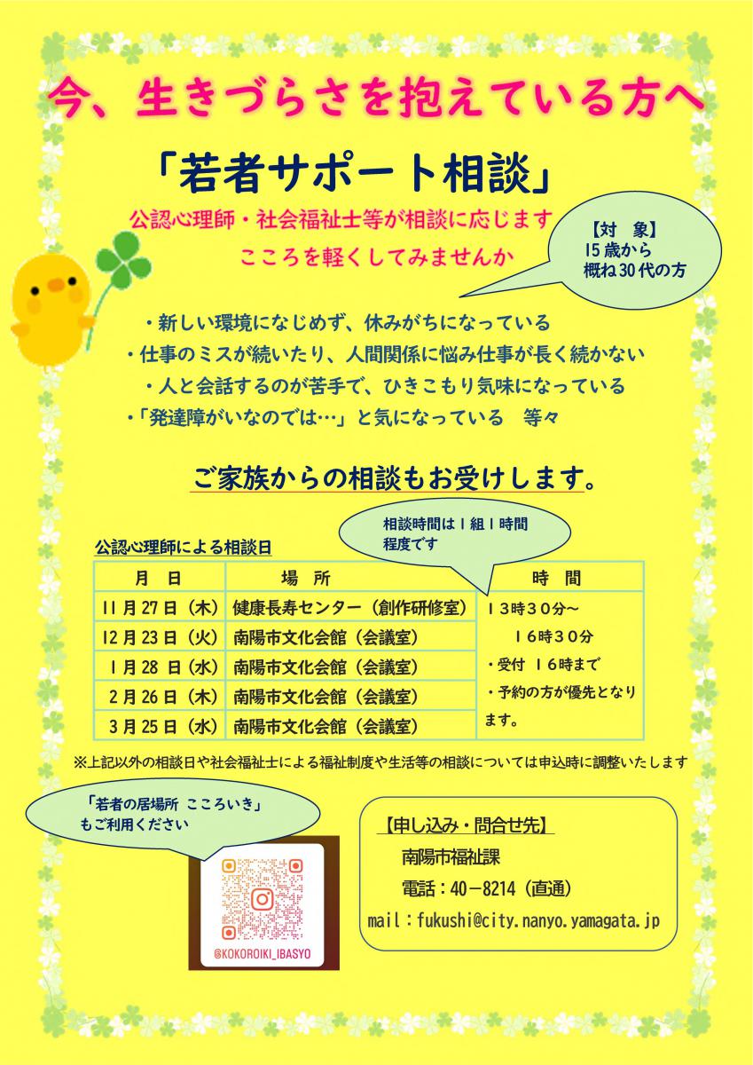 「若者サポート相談」(公認心理師・社会福祉士等による) 人との関わりや発達の不安など生きづらさを抱えている若者のための相談事業 令和6年5月1日更新 令和6年12月2日更新 令和7年4月14日更新 令和7年11月20日更新