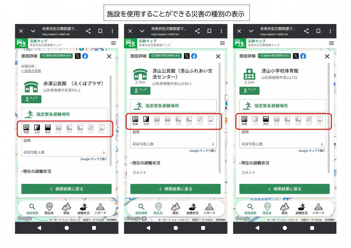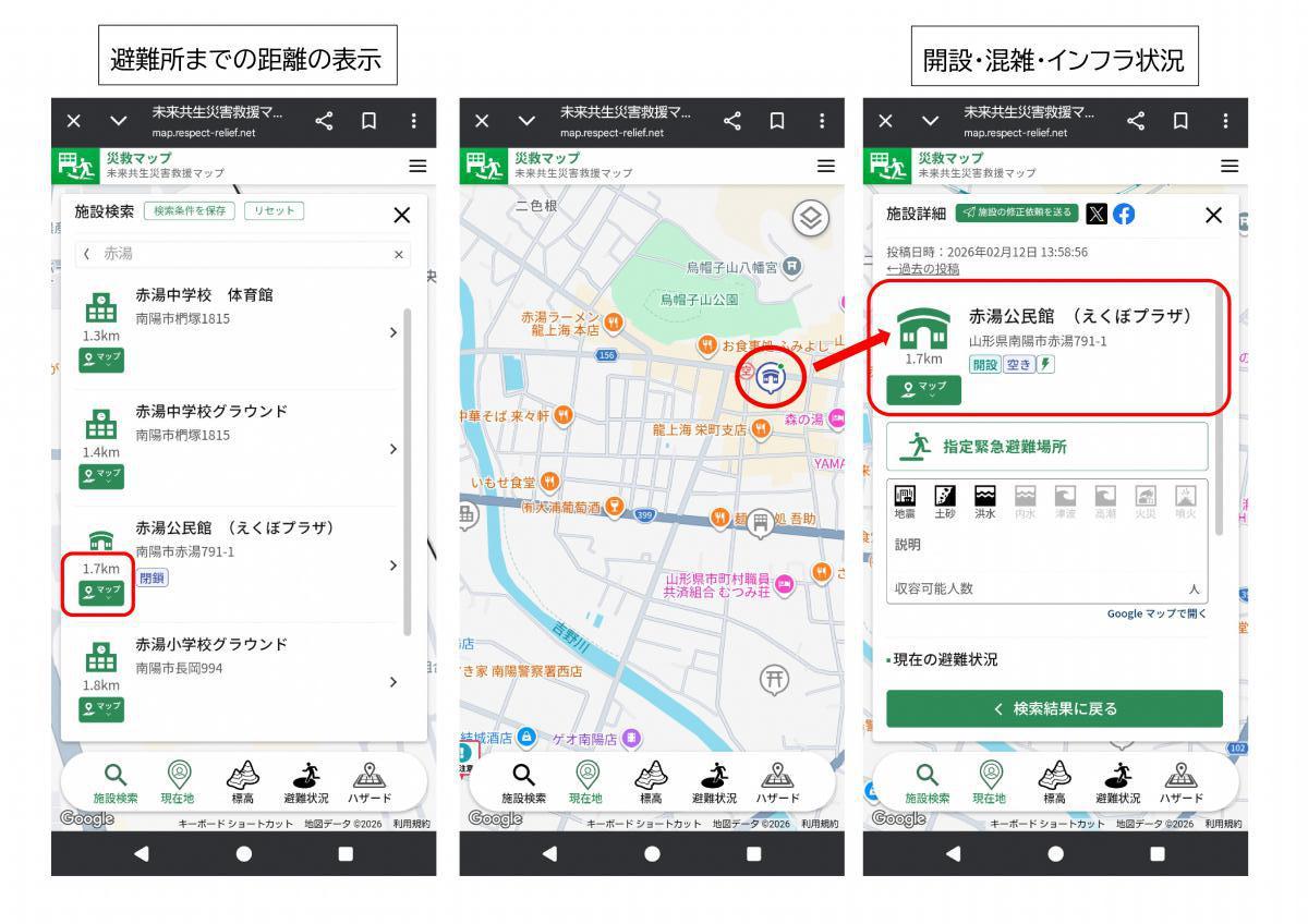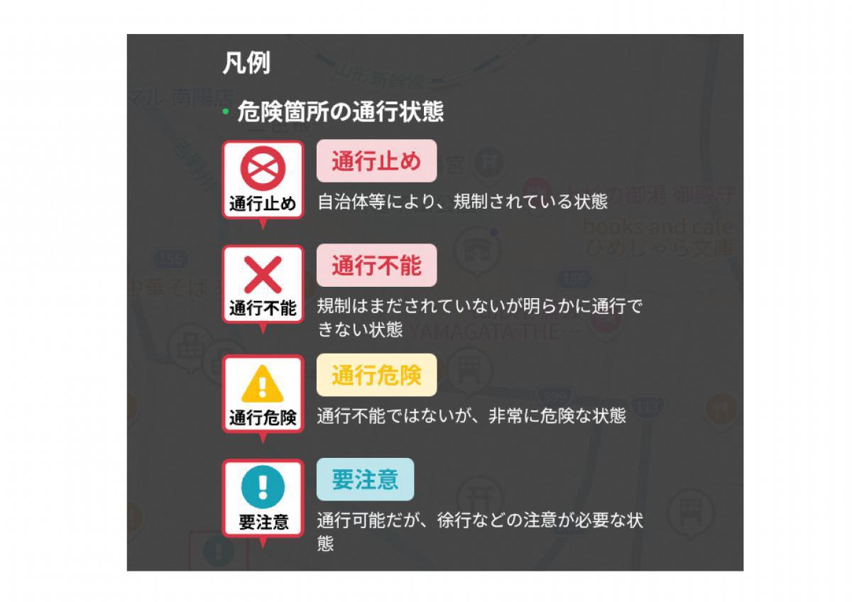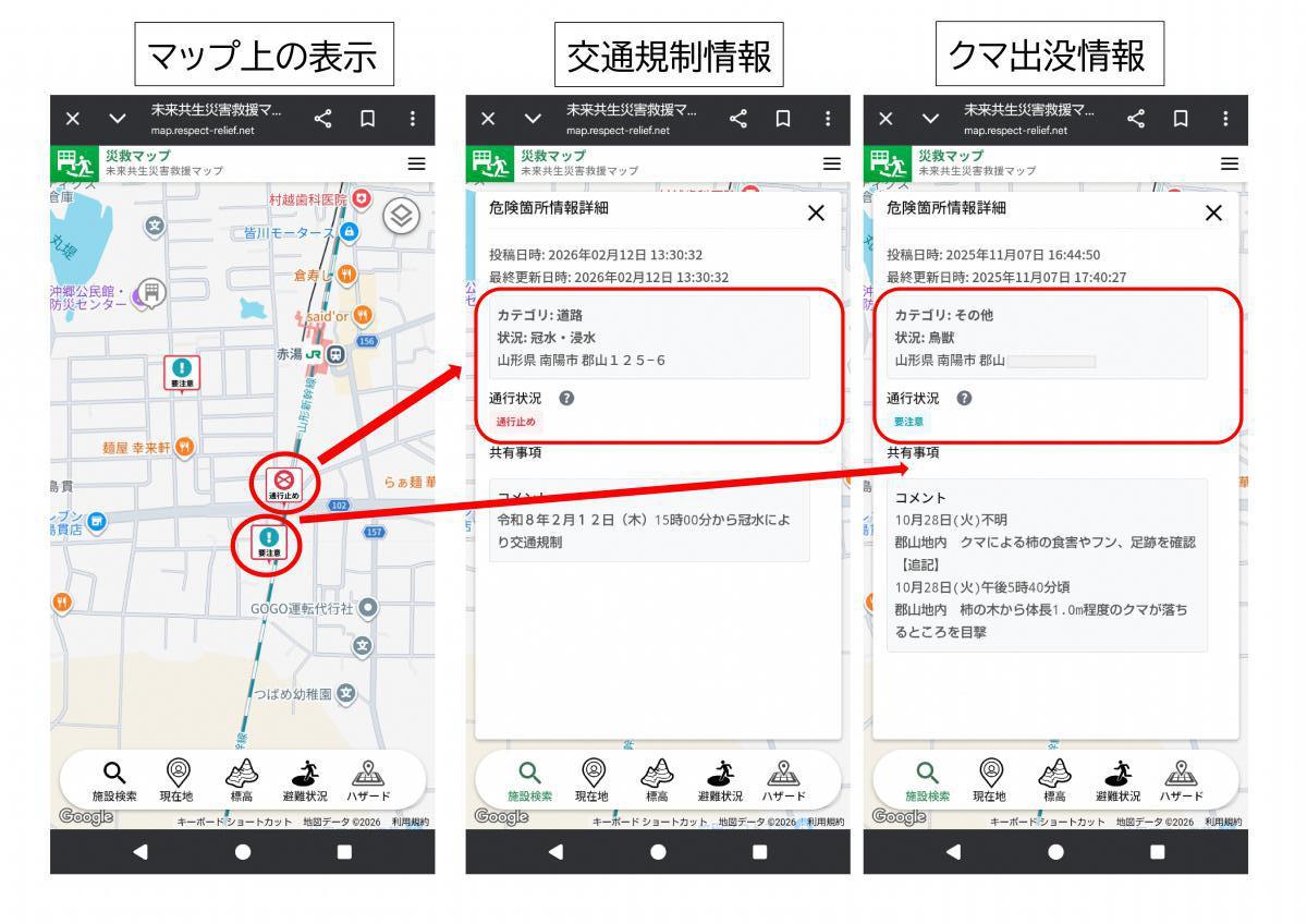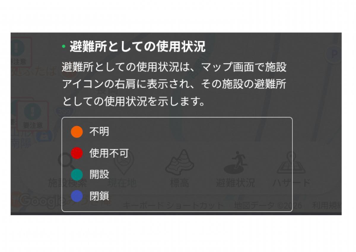 簡単な操作で災害時の避難所情報や道路状況などリアルタイムで把握することができるものです。
