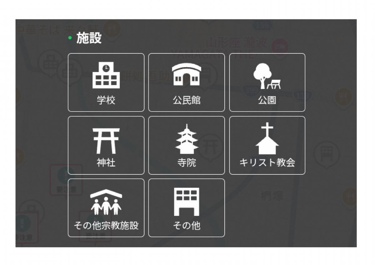 施設の種類に応じて8つの異なるアイコンでマップ上に表示します。