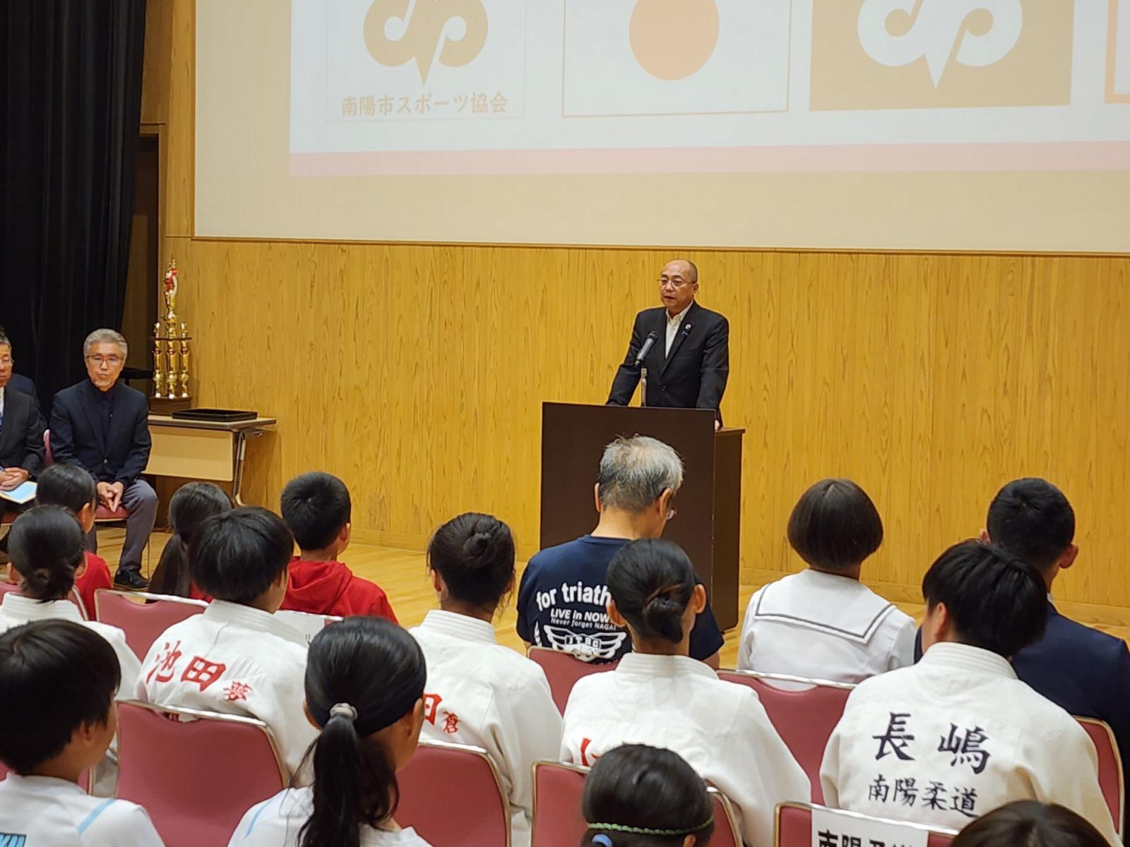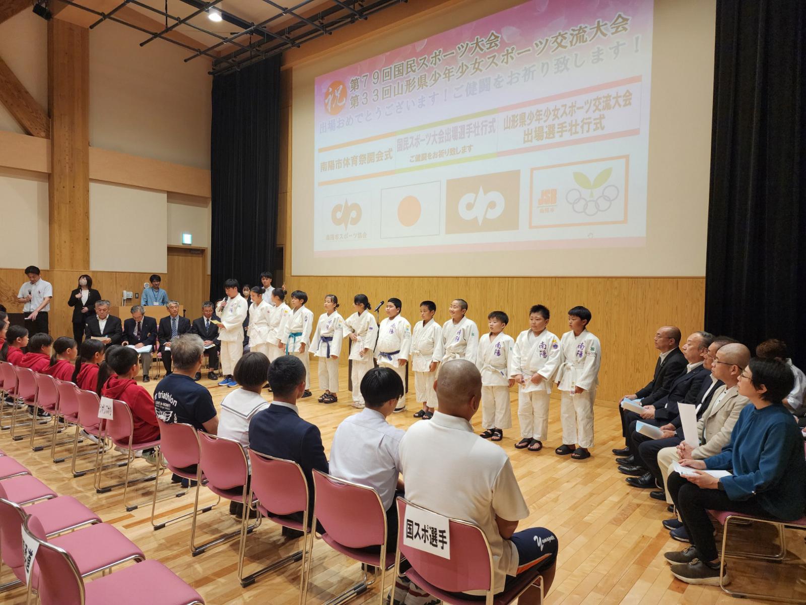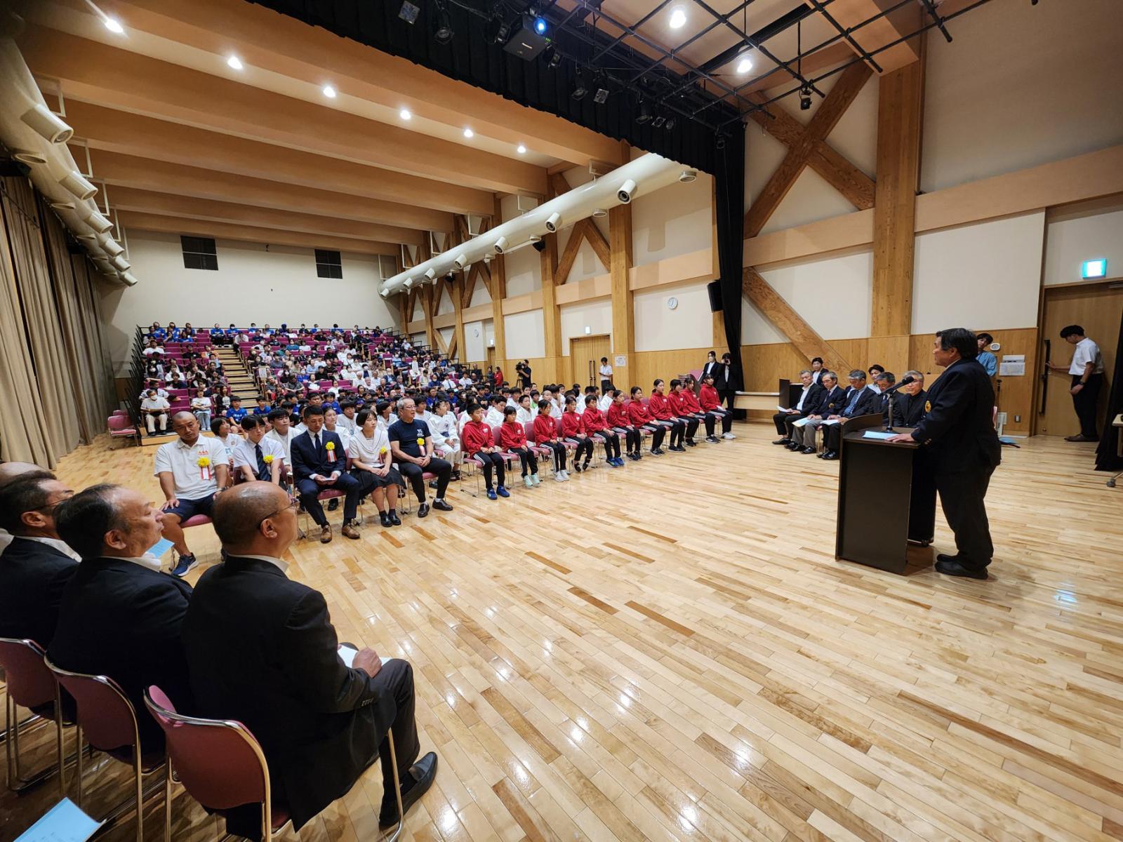 9月18日(木)、シェルターなんようホール(文化会館)において、「第51回南陽市体育祭総合開会式 兼 第79回国民スポーツ大会出場選手壮行式、第33回山形県少年少女スポーツ交流大会出場選手壮行式」が行われました。来賓の白岩孝夫南陽市長は、「大会では、みなさんの能力の全てを発揮できるよう、応援しております。どうぞ頑張ってください」と激励の言葉を送りました。