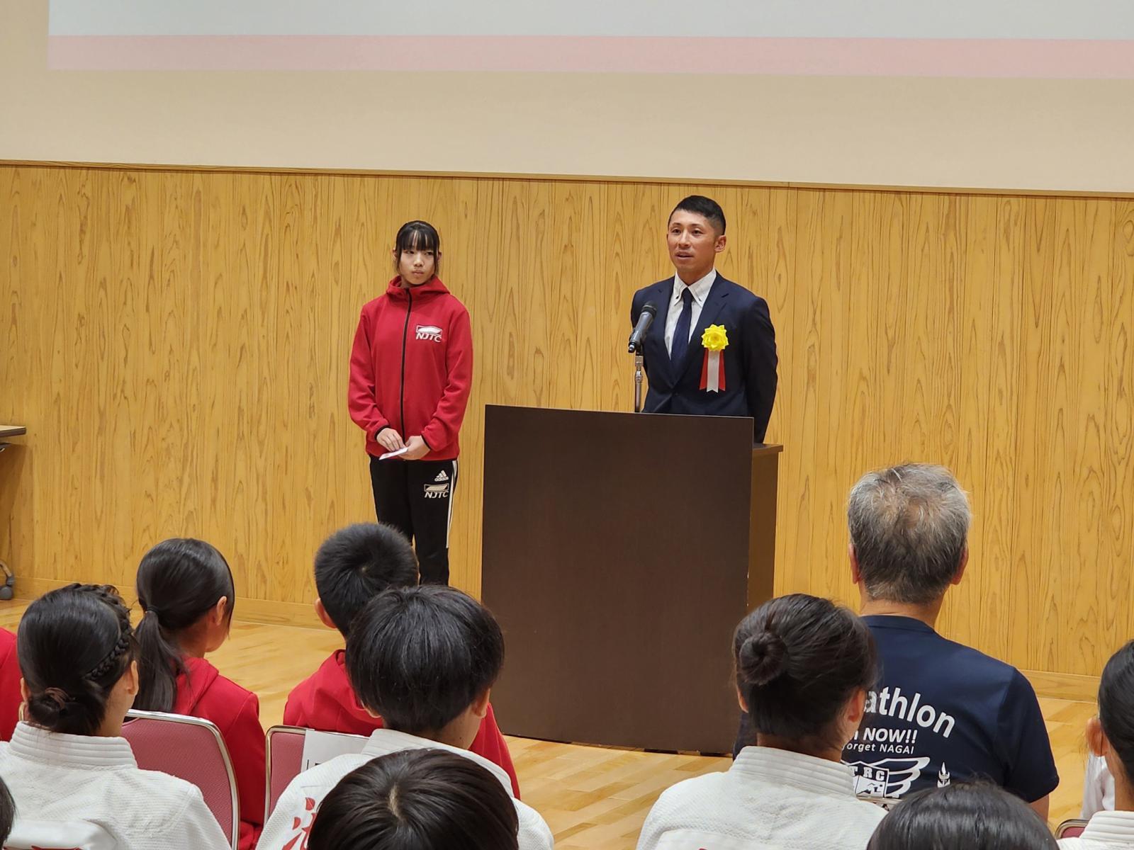 その後、選手を代表して、樋口真大(公徳会 佐藤病院)選手(国民スポーツ大会成年男子軟式野球競技出場)と松田莉乃選手(県少年少女スポーツ交流大会 トランポリン競技出場)より力強い決意の言葉がありました。