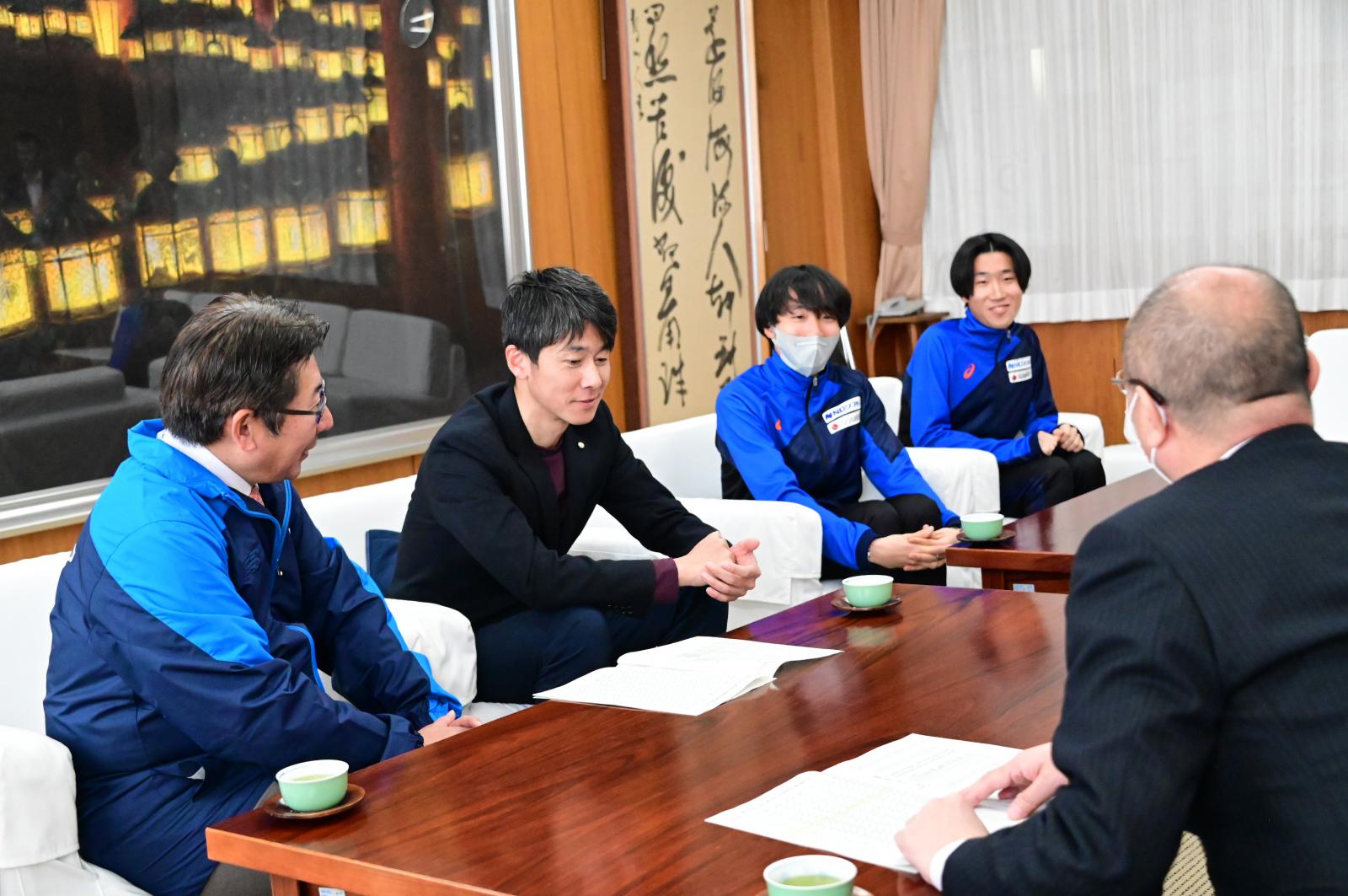 1月26日(月)、元日のニューイヤー駅伝でチーム過去最高順位を達成したNDソフトアスリートクラブのみなさんと、NDソフトウェア株式会社 松山代表取締役社長に表敬をいただきました。スタートとなる第1区を務めた東海林宏一選手は「昨年チームに加入して勢いのあるチームだと感じた。そのチームのスタートを務める自分の役割として思い切って飛び出した。今後は記録も残していきたい」と話し、第3区で流れを変える好走を見せた下條乃將選手は「(2年前も同区間を走り)もっと風があったら持ち味を発揮できる自信はあったが、自分の役割は果たせたと思う」とレースを振り返りました。