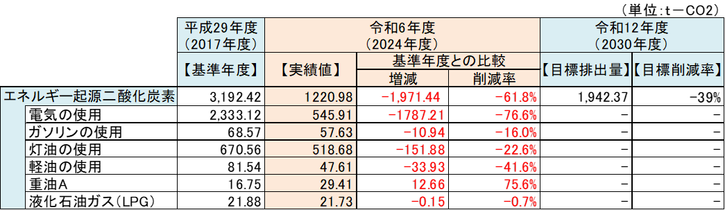令和6年度の取組結果を取りまとめました。市が保有する各学校施設、社会教育施設等に二酸化炭素を排出しない再生可能エネルギー由来の電気を導入したこと。市庁舎に設置している太陽光発電パネルにより発電された電気を使用すること等の取組により、温室効果ガス排出量の削減に努めました。