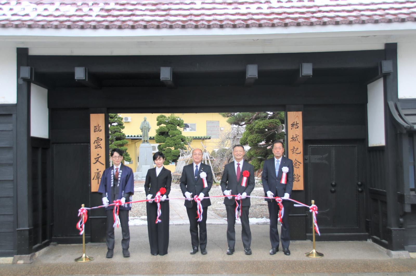 多くの方からご寄付いただき修繕した臨雲文庫表門の竣工式典を執り行いました。式典では、白岩市長より「表門は故郷の発展と人材育成にかける結城先生の情熱の象徴である。故郷を心から愛した結城先生の想いを未来に繋ぐためにもこの門を後世に残し広く伝えてまいりたい。」と式辞を述べられました。表門では厳かにテープカットが行われ、修繕した門の完成を祝いました。