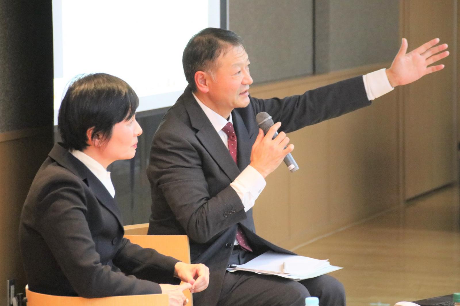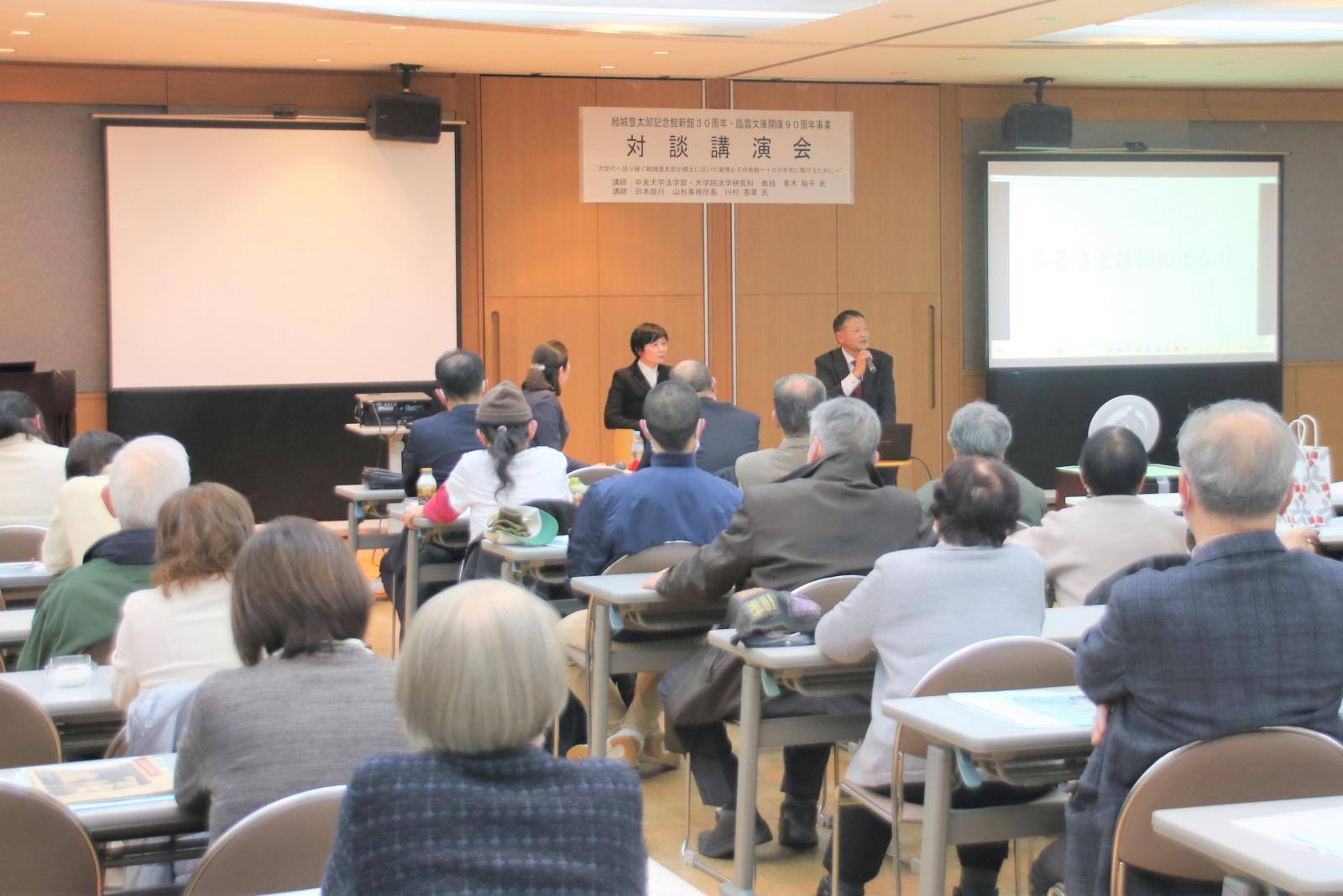 中央大学法学部・大学院法学研究科 教授の青木裕子氏(結城翁ご曽孫)と、日本銀行山形事務所長の川村憲章氏のお二人を講師にお迎えし、結城翁にまつわる貴重なご講演をいただいた後、「結城翁の教えを未来の社会にどう活かすか」をテーマにした対談が行われました。ご来場いただいた皆様には、記念として結城翁の顔が焼き印された紅白大福餅も振る舞われ、イベントに彩を添えました。
