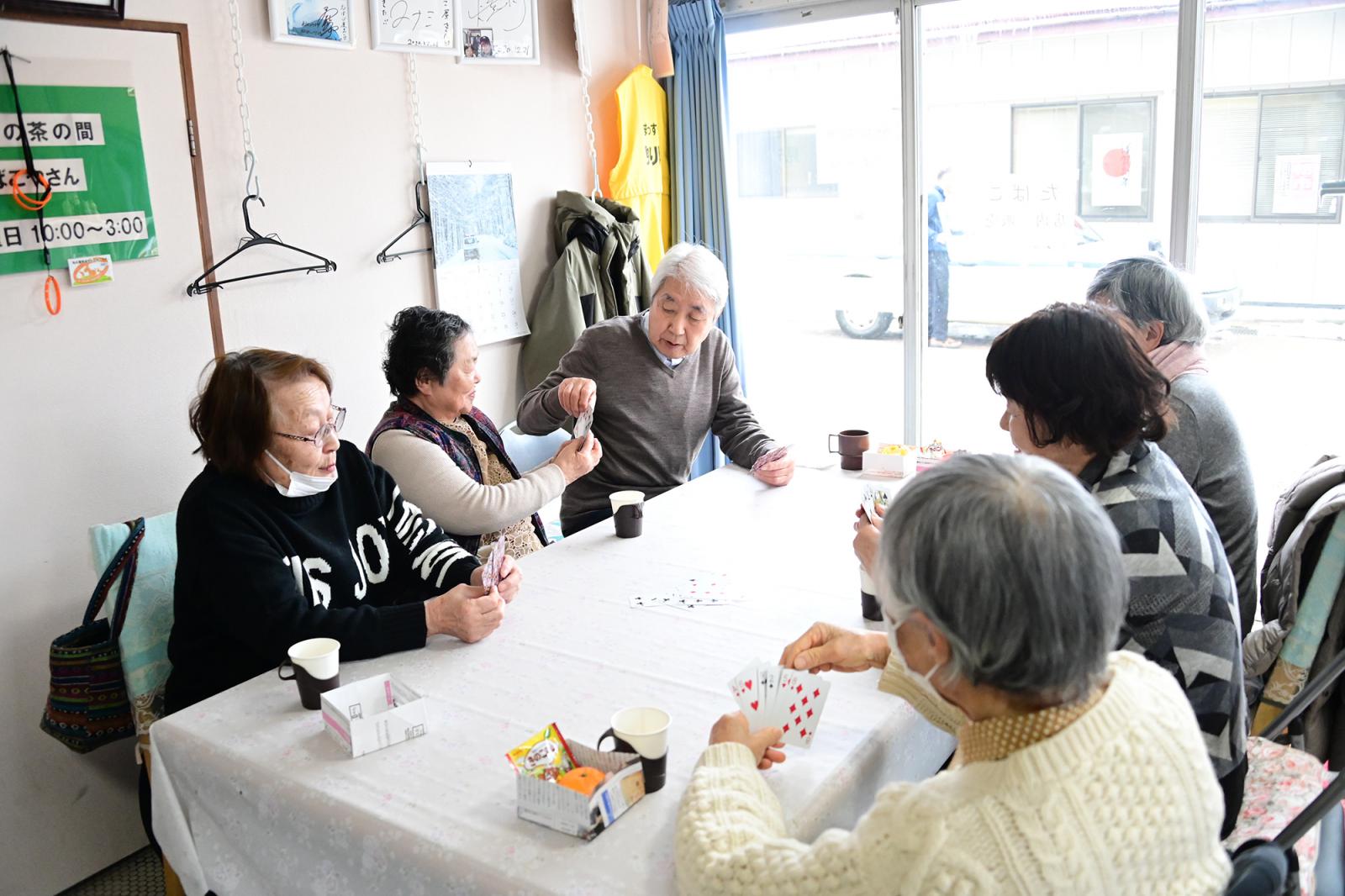 赤湯温泉街でたばこやを営む髙橋さんが自宅兼店舗を活用し平成31年に開設しました。皆さん自宅の茶の間のようにリラックスして過ごしています。この日は軽体操やトランプをして楽しんでいました。開放感があり、気軽に出入りがしやすい雰囲気があります。